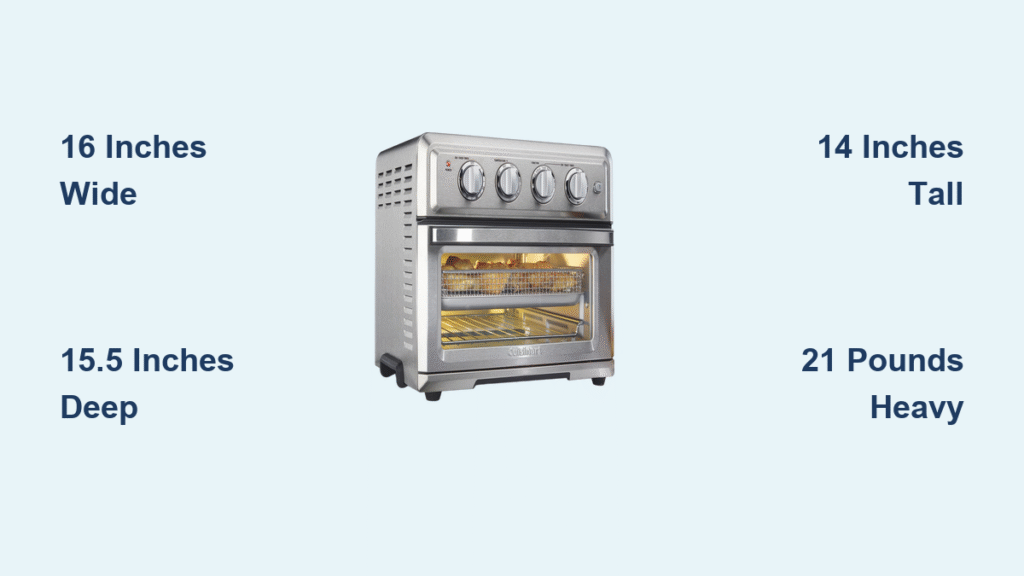 Before you bring home the Cuisinart TOA-60 air fryer, you need to know exactly how much space this countertop powerhouse requires. Many enthusiastic buyers discover too late that their dream appliance won’t fit their kitchen layout, forcing them into the hassle of returns or awkward rearrangements. The Cuisinart air fryer dimensions and size specifications reveal a countertop unit measuring precisely 16 inches wide, 15.5 inches deep, and 14 inches tall—measurements that could make or break your kitchen configuration.