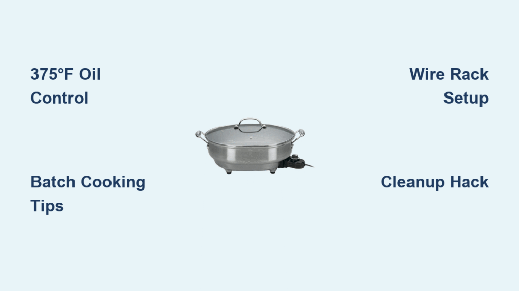 Line your counter with paper towels under the wire rack to catch drips. Once frying finishes, unplug the skillet and let oil cool 10 minutes. Wipe interior with paper towels while warm (never pour hot oil down drains). For stubborn residue, fill with 1 inch water, heat to 180°F, then wipe. Pro move: Store the temperature probe in the skillet’s cord wrap to never lose it.