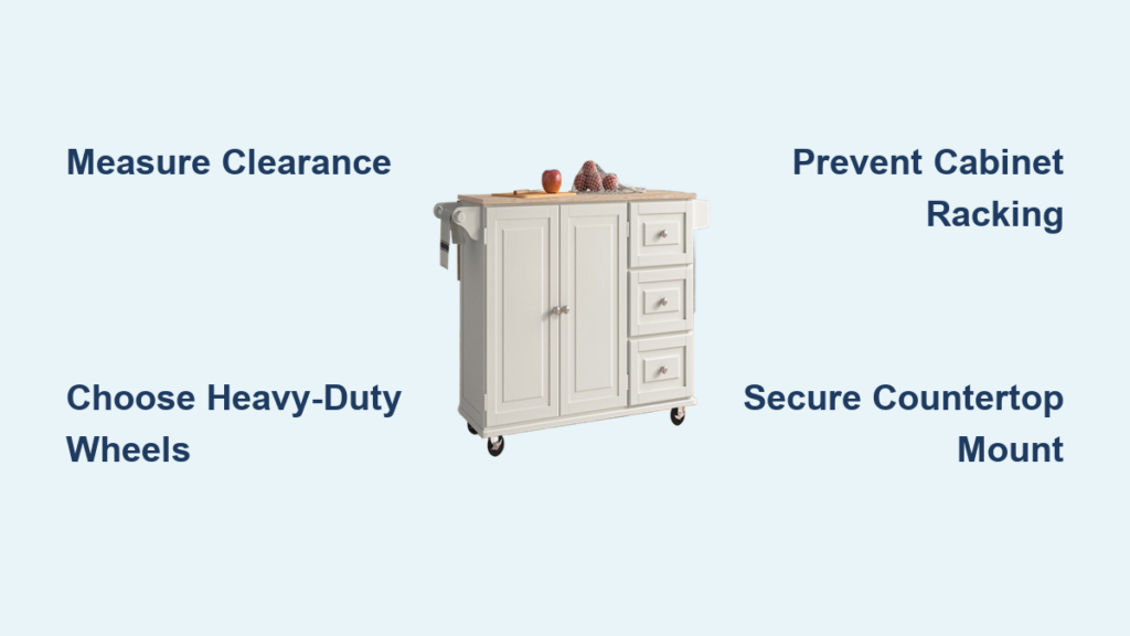 If your island wobbles during movement, check caster mounting security and frame squareness first. Tighten all fasteners and verify corner joints remain at 90 degrees. Add diagonal bracing in cabinet corners if frame has loosened over time. Wobble often stems from uneven floor surfaces—adjustable leveling feet on casters can compensate for minor floor irregularities.