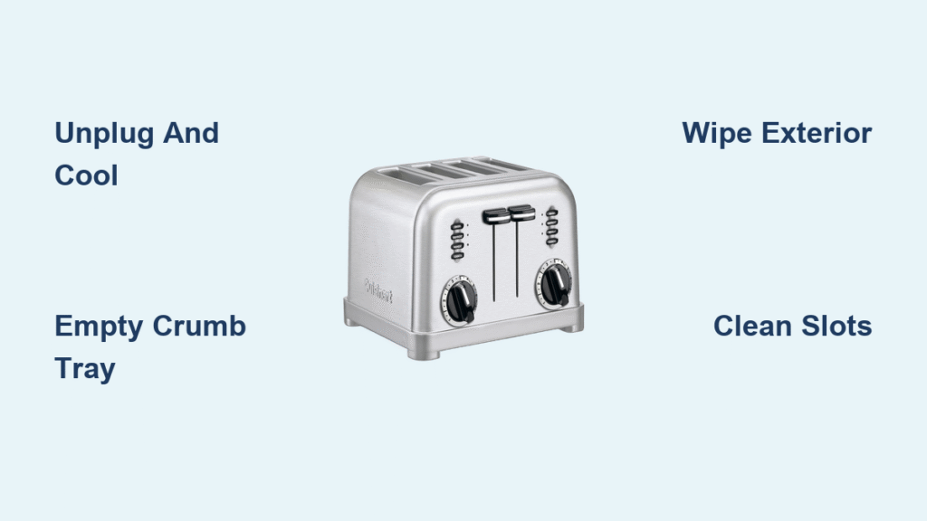 Your crumb tray is the #1 culprit behind smoke alarms blaring at breakfast. Most Cuisinart 4-slice models (like the CPT-180) have a flat tray that slides straight out the back—never tilt it upward during removal. Tilting dumps trapped crumbs into the toaster’s interior, creating fire hazards. Instead, pull horizontally over your trash can while tapping gently. If crumbs resist falling, use a wooden toothpick to dislodge stubborn chunks from the tray’s grooves.
