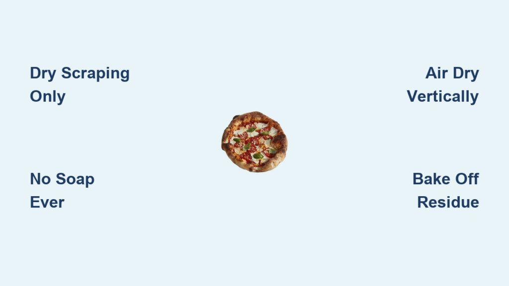 The science is non-negotiable: cordierite’s porosity makes liquid cleaners catastrophic. Skip the “deep clean” myths—your stone self-sanitizes at 500°F. Every pizza bake kills bacteria, making chemical sanitizers unnecessary and dangerous.