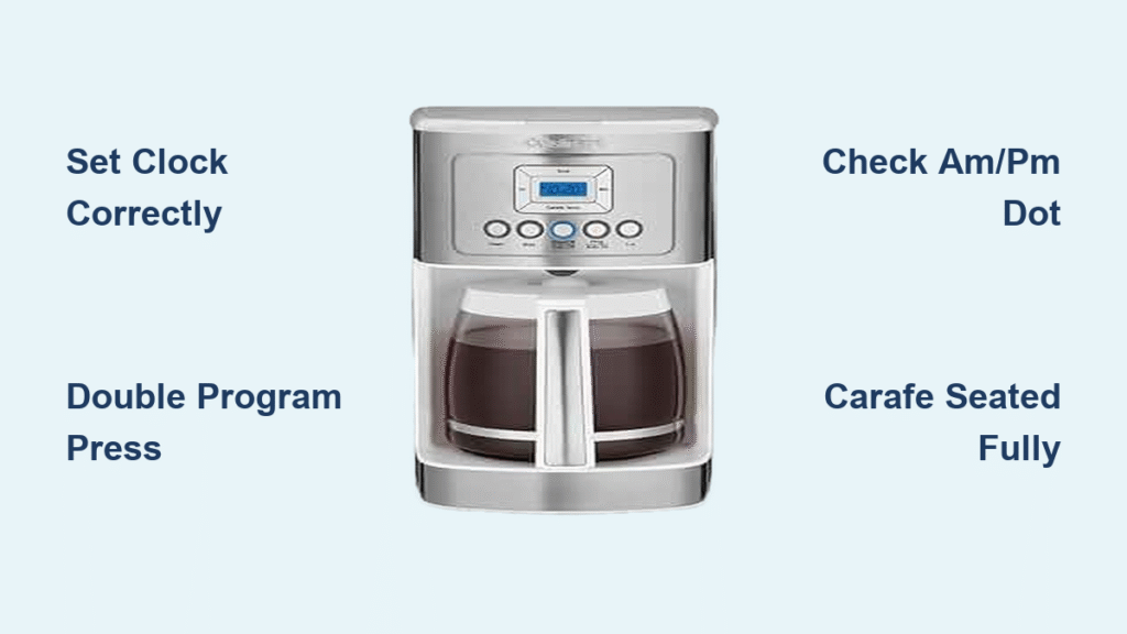 Setting 6:30 without verifying the AM/PM dot means coffee brews 12 hours late. Always point a flashlight at the display—if you see any dot, it’s PM. Fix by re-entering programming mode and toggling the time past 12:00 to flip AM/PM.