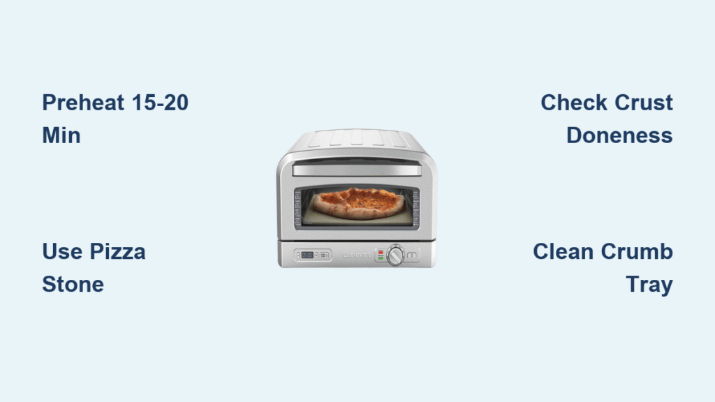 Your Cuisinart pizza oven needs breathing room to function safely and efficiently. Place it on a heat-resistant surface with at least 6 inches of clearance on all sides and 12 inches above. Never position near cabinets, curtains, or other heat-sensitive materials. Before first use, remove all packaging materials including the cardboard base protector and plastic film from interior surfaces—these often get overlooked but can cause smoke or odors during initial heating.