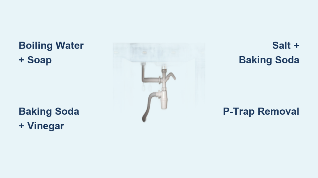 | Grease buildup with slow drainage | Boiling water + dish soap | 85% for minor clogs |